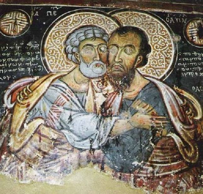 Οἱ τῶν Ἀποστόλων πρωτόθρονοι, καὶ τῆς Οἰκουμένης διδάσκαλοι, τῷ Δεσπότῃ τῶν ὅλων πρεσβεύσατε, εἰρήνην τῆ οἰκουμένῃ δωρήσασθαι, καὶ ταῖς ψυχαῖς ἡμῶν τὸ μέγα ἔλεος.