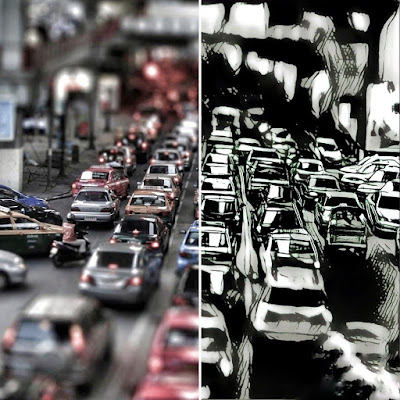 Μέσα στις βρισιές για την καθυστέρηση, τα κορναρίσματα των βιαστικών, τις εξατμίσεις των μηχανών, τον ήχο των κινητών, τους χλευασμούς των διπλανών· σταματά να λέγει την ευχή.