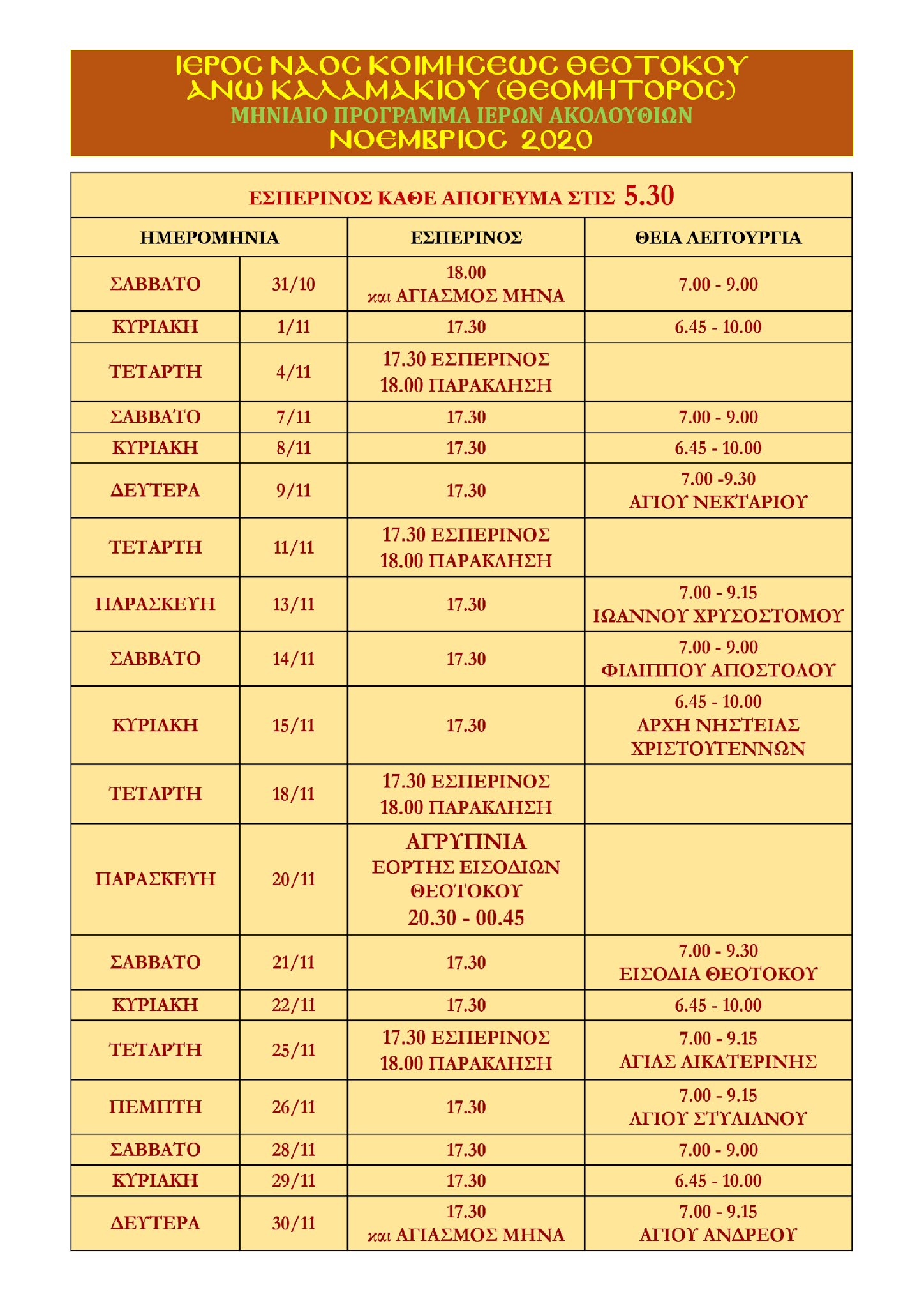 ΠΡΟΓΡΑΜΜΑ ΑΚΟΛΟΥΘΙΩΝ ΝΟΕΜΒΡΙΟΥ 2020