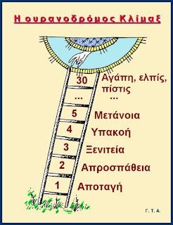 «Ἐάν, ὦ ἐραστά, δὲν λυθῆς ἀπὸ τὴν παχύτητα τοῦ σώματος, δὲν θὰ μπορέσης νὰ γνωρίσης τὸ κάλλος τοῦ προσώπου μου. Ἡ κλίμαξ ἂς σὲ διδάσκη τὴν πνευματικὴ σύνθεσι τῶν ἐπὶ μέρους ἀρετῶν. Στὴν κορυφὴ δὲ αὐτῆς τῆς κλίμακος εἶμαι στηριγμένη ἐγώ, καθὼς τὸ εἶπε ὁ μεγάλος μύστης μου, (ὁ Ἀπόστολος Παῦλος): «Νυνὶ δὲ μένει τὰ τρία ταῦτα· πίστις, ἐλπίς, ἀγάπη· μείζων δὲ πάντων ἡ ἀγάπη» (Α´ Κορ. ιγ´ 13).