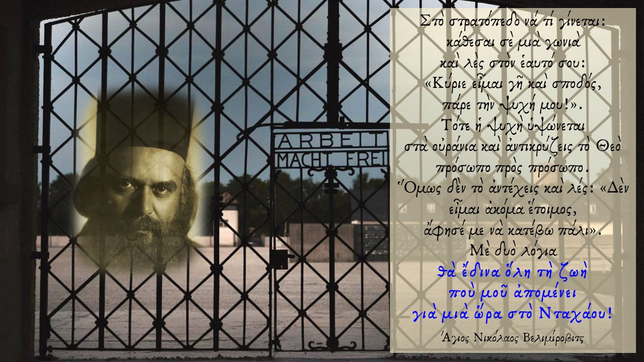 «…Στην ύπαιθρο, πίσω από την παράγκα, οι Ορθόδοξοι Έλληνες και Σέρβοι είχαν συγκεντρωθεί. Στο κέντρο, οι δύο ιερείς, ο Σέρβος και ο Ἐλληνας. Δεν φορούν χρυσά άμφια. Δεν έχουν ακόμη ράσα. Δεν έχουν κεριά ούτε λειτουργικά βιβλία στα χέρια τους. Αλλά τώρα δεν χρειάζονται εξωτερικά, υλικά φώτα για να υμνήσουν τη χαρά. Οι ψυχές όλων είναι φλεγόμενες, κολυμπούν στο φως.