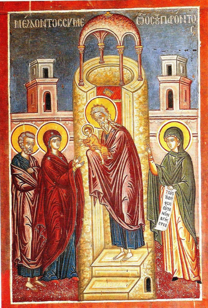 Μέλλοντος Συμεῶνος, τοῦ παρόντος αἰῶνος, μεθίστασθαι τοῦ ἀπατεῶνος, ἐπεδόθης ὡς βρέφος αὐτῷ, ἀλλ᾿ ἐγνώσθης τούτῳ καὶ Θεὸς τέλειος· διό περ ἐξεπλάγη, σοῦ τὴν ἄῤῥητον σοφίαν, κράζων· Ἀλληλούϊα.