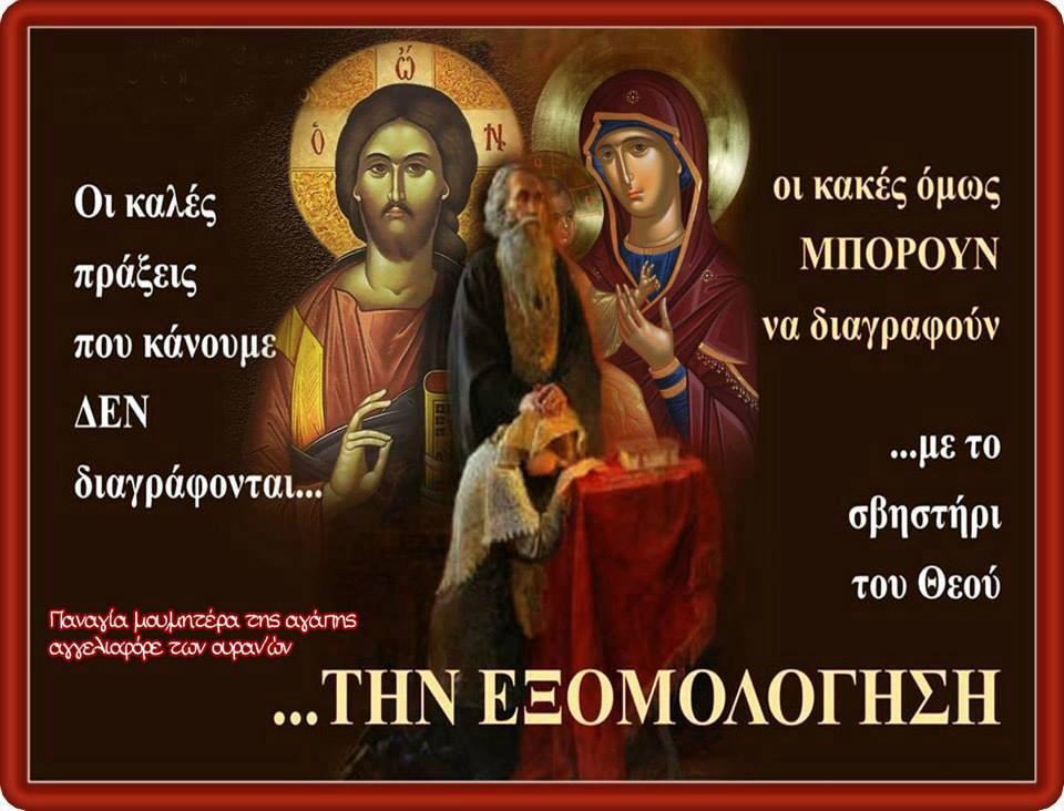 «ἐάν ὁμολογῶμεν τάς ἁμαρτίας ἡμῶν, πιστός ἐστι καί δίκαιος, ἵνα ἀφῇ ἡμῖν τάς ἁμαρτίας καί καθαρίσῃ ἡμας ἀπό πάσης ἀδικίας». ( Α΄ Ἰωάν. α΄, 9 )