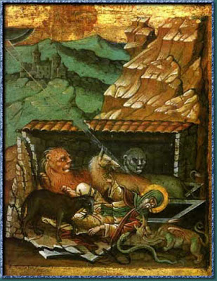 Ήτανε σε μια μάχη ο Άγιος αυτός, σε μάχη όχι με όπλα, σε μάχη πιο ισχυρή, σε μάχη με δαίμονες. Είχε μεταμορφωθεί ο διάβολος σε λιοντάρι και τον έκοβε κομμάτια να τον βγάλει από το δρόμο του Θεού και εκεί επάλευε.