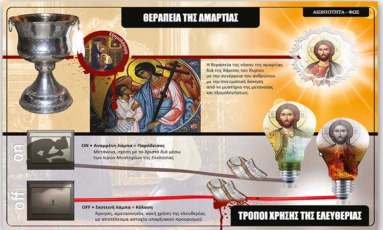 Αμαρτία είναι να κλείσω το κουμπί του δωματίου από το φως και έτσι έχουμε σκοτάδι. Άρα το σκοτάδι , ο θάνατος και η κόλαση δεν είναι κάτι που μου το δίνει ο Θεός αλλά κάτι που το επιλέγω μέσα από την προσωπική μου ελευθερία. Αν δεν κλείσω το διακόπτη το σκοτάδι δεν θα υπάρξει ποτε. Αυτό το Φώς είναι ο Χριστός και η σχέση μαζί του μέσα από τα μυστήρια της Εκκλησίας και σκοτάδι είναι η άρνηση να υπάρξω μαζί του.
