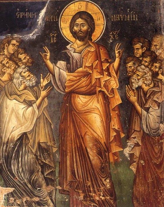 Ο Λυτρωτής δίνει την ειρήνη του στους μαθητές του τη στιγμή που πρόκειται να μπή στην περιοχή του Πάθους του.Έχοντας μπροστά του την τρομακτική οδύνη του Σταυρού και τον άμεσο θάνατο, μιλάει για την ειρήνη του και μεταγγίζει την ειρήνη του. Αφού ο Ιησούς, σ’ αυτήν ακριβώς τη στιγμή παραμένει ο κύριος της ειρήνης, η δύναμή της δεν θα εγκαταλείψη το μαθητή στις μικρότερες θύελλες που θ’ αντιμετώπιση. «Εγώ δε λέγω μή αντιστήναι τω πονηρώ» (Ματθ. 5, 39).