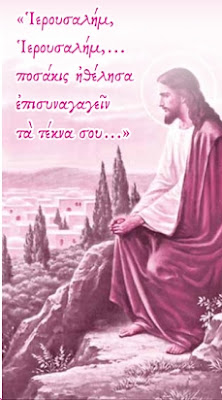 Λίγο πρὶν γραφτεῖ ὁ ἐπίλογος τῆς δηµοσίας δράσεως τοῦ Κυρίου· λίγο πρὶν ἀνηφορίσει στὸ λόφο τοῦ Γολγοθᾶ γιὰ νὰ ἀνοίξει τὰ πανάχραντα χέρια Του πάνω στὸν τίµιο Σταυρὸ καὶ νὰ ἀγκαλιάσει ὁλόκληρη τὴν ἀνθρωπότητα, ρίχνει ἕνα βλέµµα καὶ θωπεύει µὲ αὐτὸ τὴν ἱερὴ πόλη. Τὴν Ἱερουσαλήµ. Τὴν πόλη ποὺ διέτρεξαν τὰ πανάγια πόδια Του. Τὴν πόλη ἡ ὁποία ἄκουσε τὴ σωτήρια διδασκαλία Του. Τὴν πόλη ἡ ὁποία ἔγινε µάρτυρας τῶν πολλῶν Του θαυµάτων. Τούτη τὴν ὥρα κάνει ὁ Κύριος σύγκριση τῶν δικῶν Του πεπραγµένων μὲ τὴν ἀνταπόκριση ποὺ βρῆκε ἀπὸ τοὺς κατοίκους τῆς ἱερῆς πόλεως. Ὑπενθυμίζει τὶς τόσες εὐεργεσίες Του πρὸς αὐτήν. «Ποσάκις…», λέει, «ἠθέλησα ἐπισυναγαγεῖν τὰ τέκνα σου…» (Ματθ. κγ΄ [23] 37).
