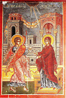 Ἔχουσα ἡ Παρθένος μὲς στὴ μήτρα της τὸν Θεό, ἔτρεξε πρὸς τὴν Ἐλισάβετ. Τὸ βρέφος ἐκείνης (ὁ Ἰωάννης) μόλις κατάλαβε τὸν χαιρετισμό της σκίρτησε ἀπὸ χαρά· καὶ μὲ σκιρτήματα ἀντὶ γιὰ ὕμνους, φώναζε δυνατὰ πρὸς τὴ Θεοτόκο·