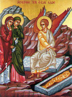 Τῷ καιρῷ ἐκείνῳ, ἐλθὼν ᾿Ιωσὴφ ὁ ἀπὸ ᾿Αριμαθαίας, εὐσχήμων βουλευτής, ὃς καὶ αὐτὸς ἦν προσδεχόμενος τὴν βασιλείαν τοῦ Θεοῦ, τολμήσας εἰσῆλθε πρὸς Πιλᾶτον καὶ ᾐτήσατο τὸ σῶμα τοῦ ᾿Ιησοῦ. ῾Ο δὲ Πιλᾶτος ἐθαύμασεν εἰ ἤδη τέθνηκε, καὶ προσκαλεσάμενος τὸν κεντυρίωνα ἐπηρώτησεν αὐτὸν εἰ πάλαι ἀπέθανε· καὶ γνοὺς ἀπὸ τοῦ κεντυρίωνος ἐδωρήσατο τὸ σῶμα τῷ ᾿Ιωσήφ. Καὶ ἀγοράσας σινδόνα καὶ καθελὼν αὐτὸν ἐνείλησε τῇ σινδόνι καὶ κατέθηκεν αὐτὸν ἐν μνημείῳ, ὃ ἦν λελατομημένον ἐκ πέτρας, καὶ προσεκύλισε λίθον ἐπὶ τὴν θύραν τοῦ μνημείου. ῾Η δὲ Μαρία ἡ Μαγδαληνὴ καὶ Μαρία ᾿Ιωσῆ ἐθεώρουν ποῦ τίθεται. Καὶ διαγενομένου τοῦ σαββάτου Μαρία ἡ Μαγδαληνὴ καὶ Μαρία ἡ τοῦ ᾿Ιακώβου καὶ Σαλώμη ἠγόρασαν ἀρώματα ἵνα ἐλθοῦσαι ἀλείψωσιν αὐτὸν. Καὶ λίαν πρωῒ τῆς μιᾶς σαββάτων ἔρχονται ἐπὶ τὸ μνημεῖον, ἀνατείλαντος τοῦ ἡλίου. Καὶ ἔλεγον πρὸς ἑαυτάς· Τίς ἀποκυλίσει ἡμῖν τὸν λίθον ἐκ τῆς θύρας τοῦ μνημείου; Καὶ ἀναβλέψασαι θεωροῦσιν ὅτι ἀποκεκύλισται ὁ λίθος· ἦν γὰρ μέγας σφόδρα. Καὶ εἰσελθοῦσαι εἰς τὸ μνημεῖον εἶδον νεανίσκον καθήμενον ἐν τοῖς δεξιοῖς, περιβεβλημένον στολὴν λευκήν, καὶ ἐξεθαμβήθησαν. ῾Ο δὲ λέγει αὐταῖς· Μὴ ἐκθαμβεῖσθε· ᾿Ιησοῦν ζητεῖτε τὸν Ναζαρηνὸν τὸν ἐσταυρωμένον· ἠγέρθη, οὐκ ἔστιν ὧδε· ἴδε ὁ τόπος ὅπου ἔθηκαν αὐτόν. ᾿Αλλ᾿ ὑπάγετε εἴπατε τοῖς μαθηταῖς αὐτοῦ καὶ τῷ Πέτρῳ ὅτι προάγει ὑμᾶς εἰς τὴν Γαλιλαίαν· ἐκεῖ αὐτὸν ὄψεσθε, καθὼς εἶπεν ὑμῖν. Καὶ ἐξελθοῦσαι ἔφυγον ἀπὸ τοῦ μνημείου· εἶχε δὲ αὐτὰς τρόμος καὶ ἔκστασις, καὶ οὐδενὶ οὐδὲν εἶπον· ἐφοβοῦντο γάρ.