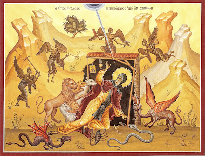 Στη συνέχεια οι δαίμονες μετασχηματίστηκαν, κατά φαντασίαν, σε ερπετά και θηρία, για να τον τρομοκρατήσουν. Γέμισε ο τόπος από λιοντάρια, αρκούδες, λεοπαρδάλεις, φίδια, λύκους και άλλα φρικτά θεάματα. Το κάθε ένα απειλούσε με το δικό του σχήμα και με τον δικό του τρόπο.